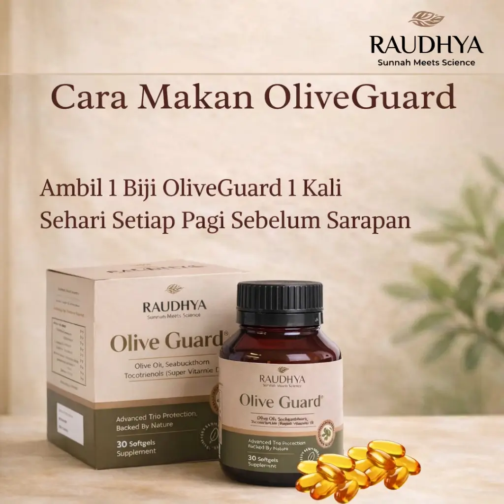 Raudhya OliveGuard+ Diperkaya Bahan Aktif Polyphenols, Tocotrienols (Super Vitamin E) & Omega Aktif Menyokong Kawalan Gula, Kolesterol & Tekanan Darah